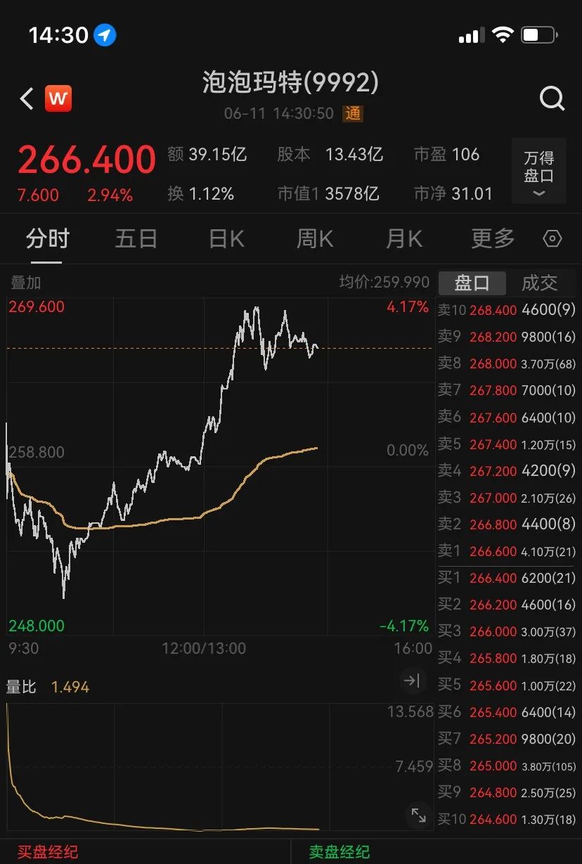 6月11日下昼,泡泡玛特一度涨超4%,股价续创历史新高,解清闲稿,涨幅收窄至2.94%,市值3578亿港元。